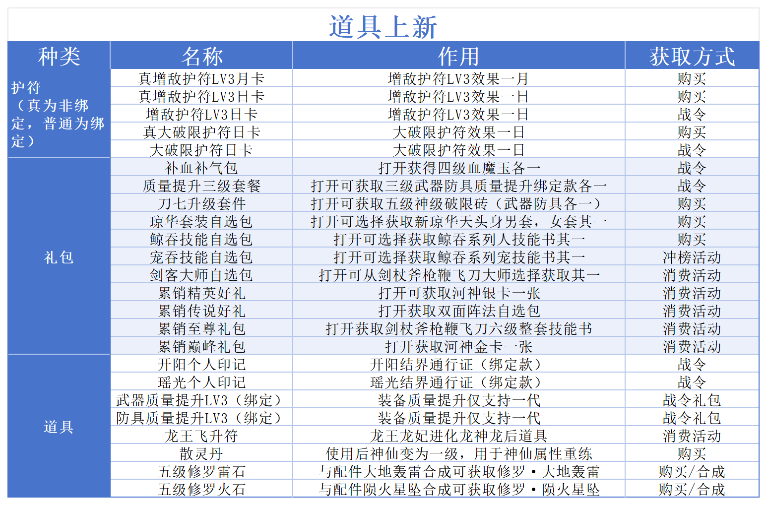 3.新护符,礼包,道具详见附件(备注挑战令(门票部分),600固伤(配件部分)与雷火石(装备强化)上架商城,寻找时可注意菜单)